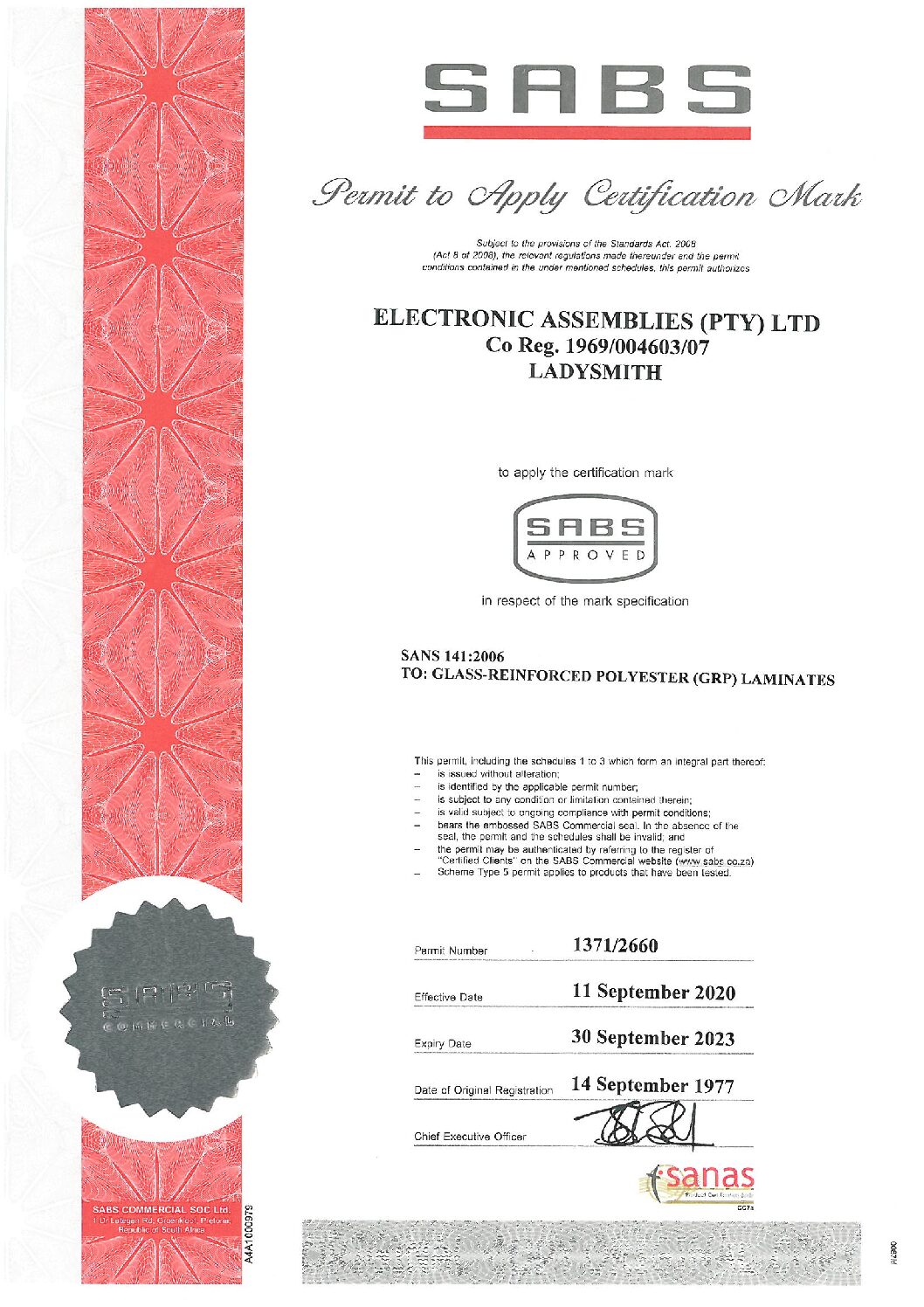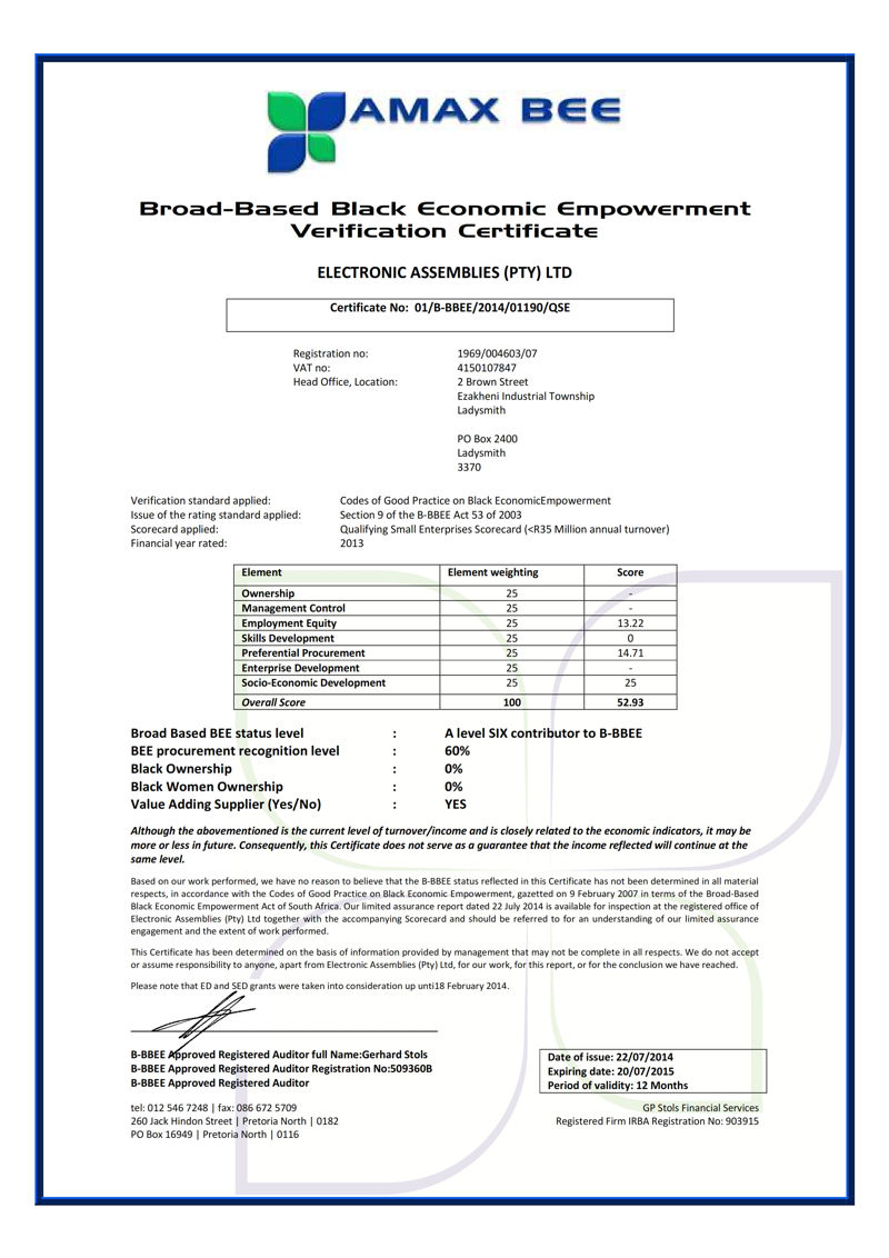 If you are interested in our certifications. Below are our BBBEE certificate and our SABS (South African Bureau of Standards) certificate.